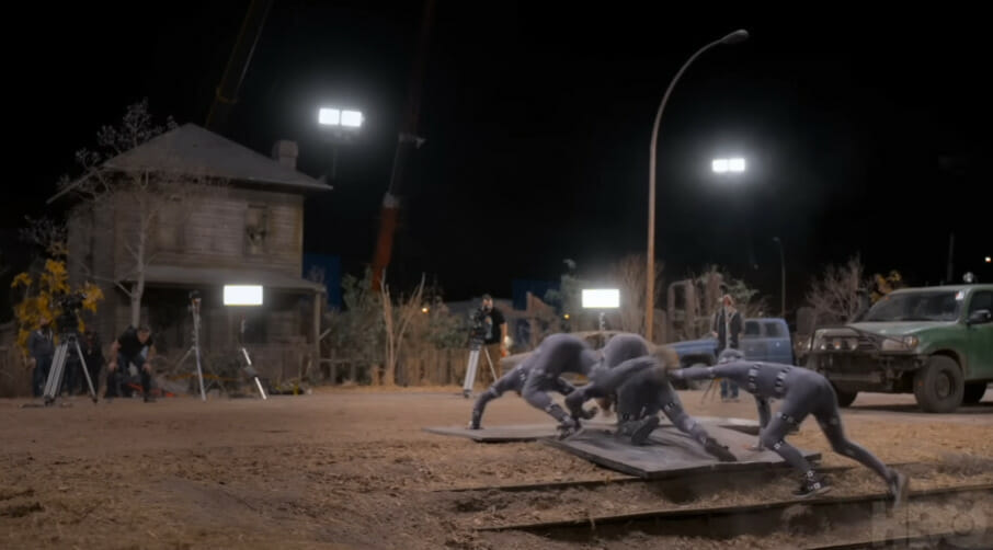 Membro da produção ajusta figurino de Clicker durante gravações do 5º episódio de The Last of Us. (Imagem: Reprodução Youtube/HBO).