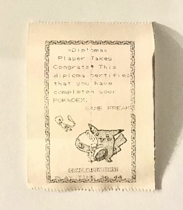 Usando o acessório, ele imprimiu um diploma reconhecendo a sua conquista. Além disso, o pedaço de papel tinha imagens de Pikachu e Mewtwo e mostrava o tempo de reprodução do arquivo salvo na parte inferior. Depis de tudo feito, deu para ver que ele levou 36 horas e 44 minutos para terminar de coletar todos os 151 Pokémon. Uma façanha e tanto, agora provada!