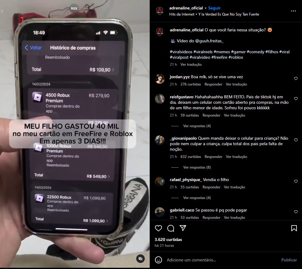 Com tudo isso, um video no instagram (obrigado pessoal da Adrenaline) mostrou um pai que estava com todo seu extrato do cartão de crédito e quase todas as compras se referiam à Roblox e Free Fire. Juntando tudo, o filho gastou R$40 mil em cosméticos e “coins” dentro dos respectivos jogos. O internautas estão comentando e são as mais variadas opiniões.