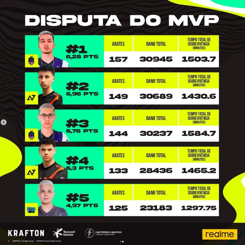 Até a final mantivemos praticamente o mesmo Top de jogadores no Ranking MVP do campeonato.FederalLilBoypela Influence RageRevoCarrilhopela Alpha7Mythic pela Rise Toico Cardozin pela Loops. A briga se mantém acirrada entre Federal e Revo para decidir quem vai levar o título de MVP da PMPL Brasil Spring ’22 e a premiação extra de US$ 1 mil.