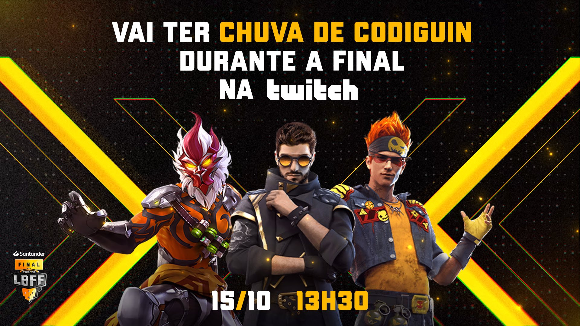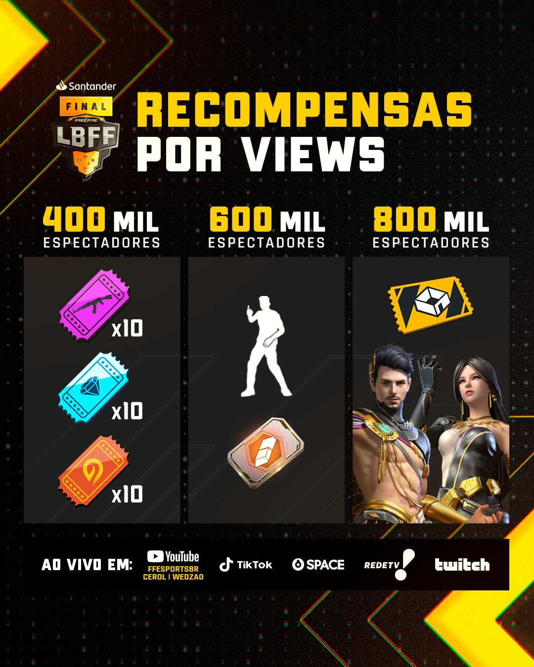 Quando a meta de 800 mil visualizações for atingida, será liberado um Cartão de Sala e Conjunto Príncipe das Areias. Os fãs que acompanharem a final em qualquer transmissão também poderão resgatar o codigão de uma mochila exclusiva da LBFF. Além disso, durante a transmissão na Twitch, também haverá a distribuição de vários CODIGUINS no chat da plataforma. |