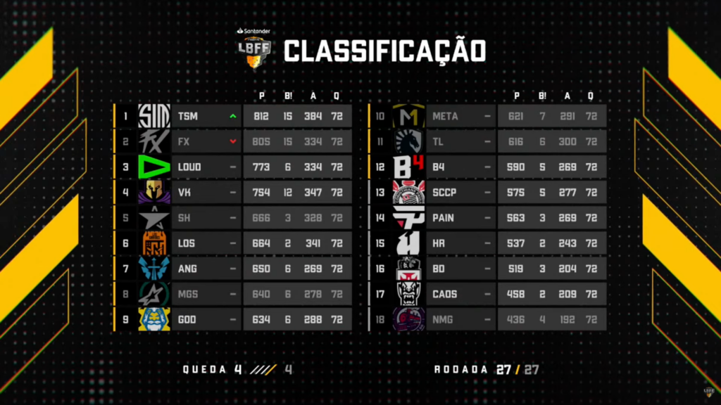 Além da premiação, que garantirá ao time vencedor R$ 105 mil, as equipes que ocuparem os dois primeiros lugares da tabela se classificarão para o Free Fire World Series (FFWS) em Bangkok, na Tailândia, que acontecerá entre os dias 25 e 26 de novembro de 2022. Além disso, pela primeira vez, os jogadores escolhidos pelos técnicos receberão o “Chama Imortal”, anel exclusivo da seleção LBFF. Quem vai ficar com a taça? As equipes classificadas são: ANGELS, B4, Fluxo, GOD Unidas, Los Grandes, LOUD, Magic Squad, Meta Gaming, Stars Horizon, Team Liquid, TSM FTX e Vivo Keyd. Este ano, cinco equipes estão em busca de um bicampeonato, o primeiro da história da LBFF. São elas: Team Liquid, Fluxo, Vivo Keyd, B4 e LOUD. A TSM FTX chega à final como líder da tabela, com 812 pontos, 384 abates e 15 Booyah!. O time é liderado por Raone7, o MVP da fase de classificação da edição. Não muito atrás na tabela, está o Fluxo, que chega à final com 805 pontos, 334 abates e 15 Booyah!. A equipe busca o seu bicampeonato. Fechando o top 3, está a LOUD, campeã mais recente da LBFF. A equipe fechou a fase de classificação com 773 pontos, 334 abates e 6 Booyah!. Entre os seus integrantes está Cauan7, jogador que ficou em segundo lugar no ranking de MVP com 116 abates. Veja como fica a tabela para a final: |