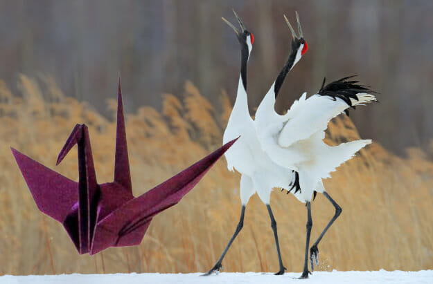 Vale lembrar que no Japão é comum fazer origamis de tsuru (pássaro conhecido como “grou” em português) como símbolo de votos para trazer felicidade e pedidos a serem realizados.