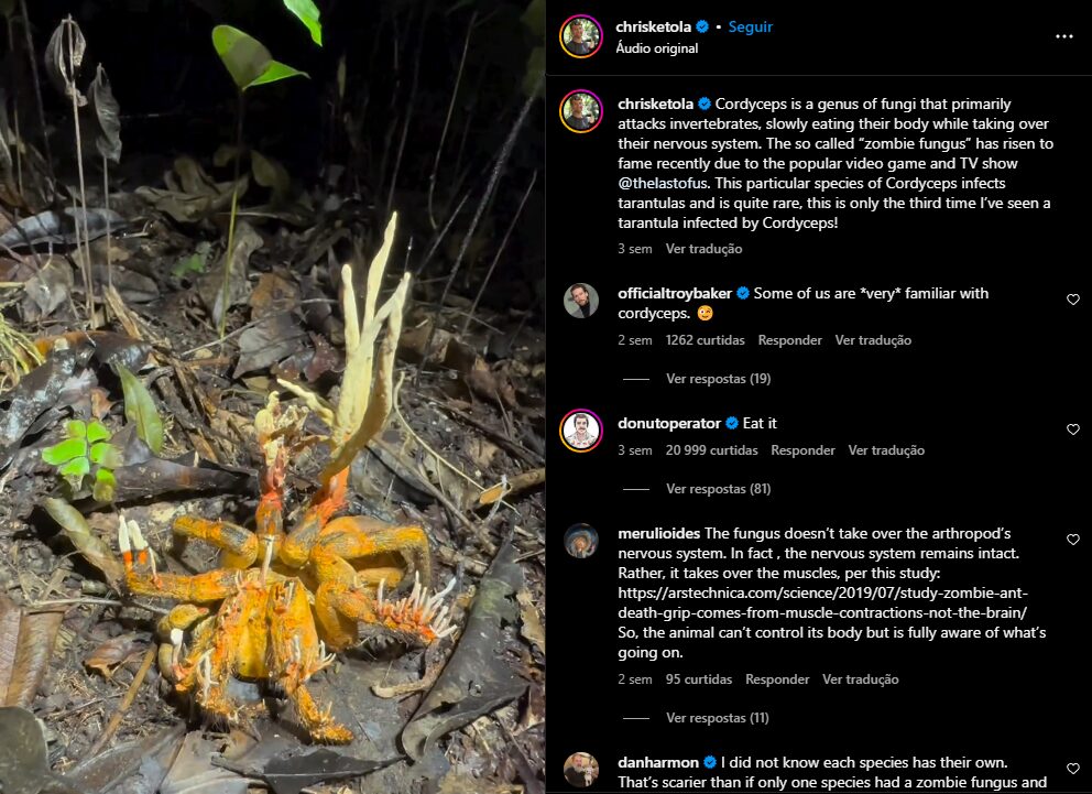 Segundo ele, esta espécie Cordyceps em específico infecta tarântulas e é bastante rara. Além disso, o pesquisador da ONG Fauna Forever também destacou que para cada grupo de invertebrados, existe uma espécie própria de Cordyceps que os infecta. Confira o vídeo que Ketola compartilhou em suas redes sociais clicando aqui.