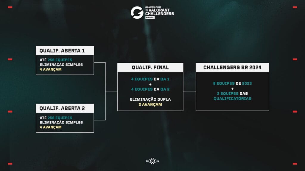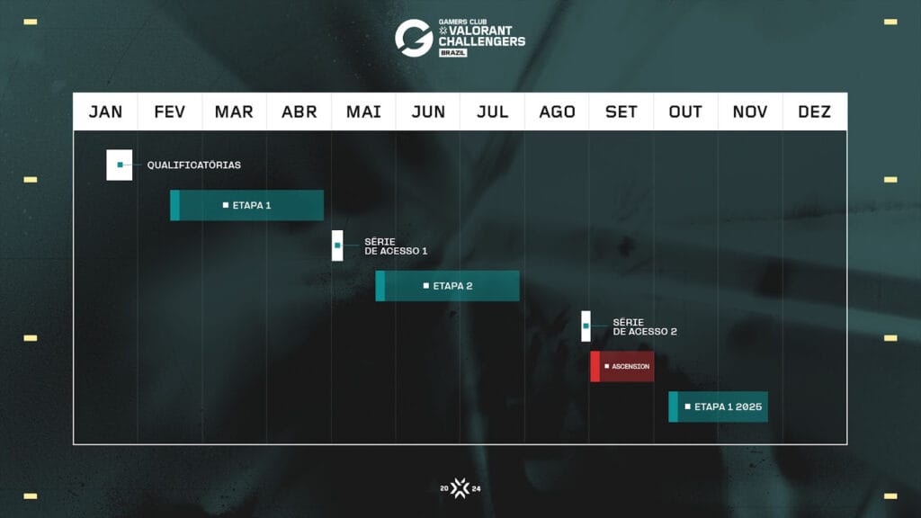 O Gamers Club VALORANT Challengers Brazilacontecerá entre os meses de fevereiro e novembro com duas Etapas em formato de liga, referente à temporada de 2024, e uma etapa em formato de copa, no final do ano, referente à temporada de 2025 – com mais detalhes a serem anunciados posteriormente. Portanto, o calendário do ano será mais extenso, se comparado ao atual.