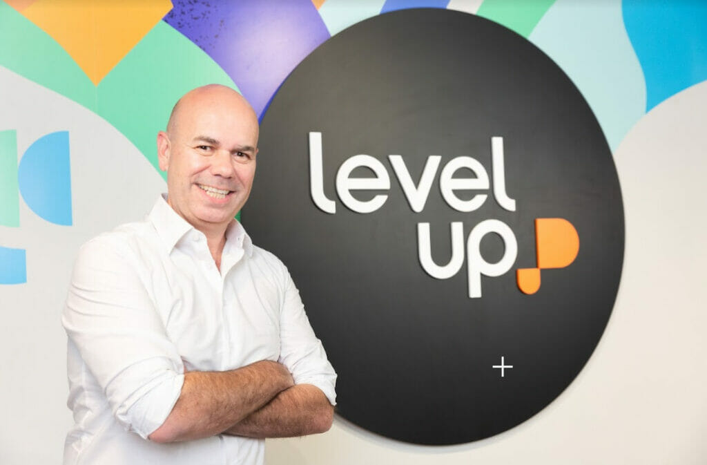 Glaucio Marques, CEO da Level Up Brasil e Latam posa ao lado no novo logotipo da empresa. (Imagem: Level Up)
