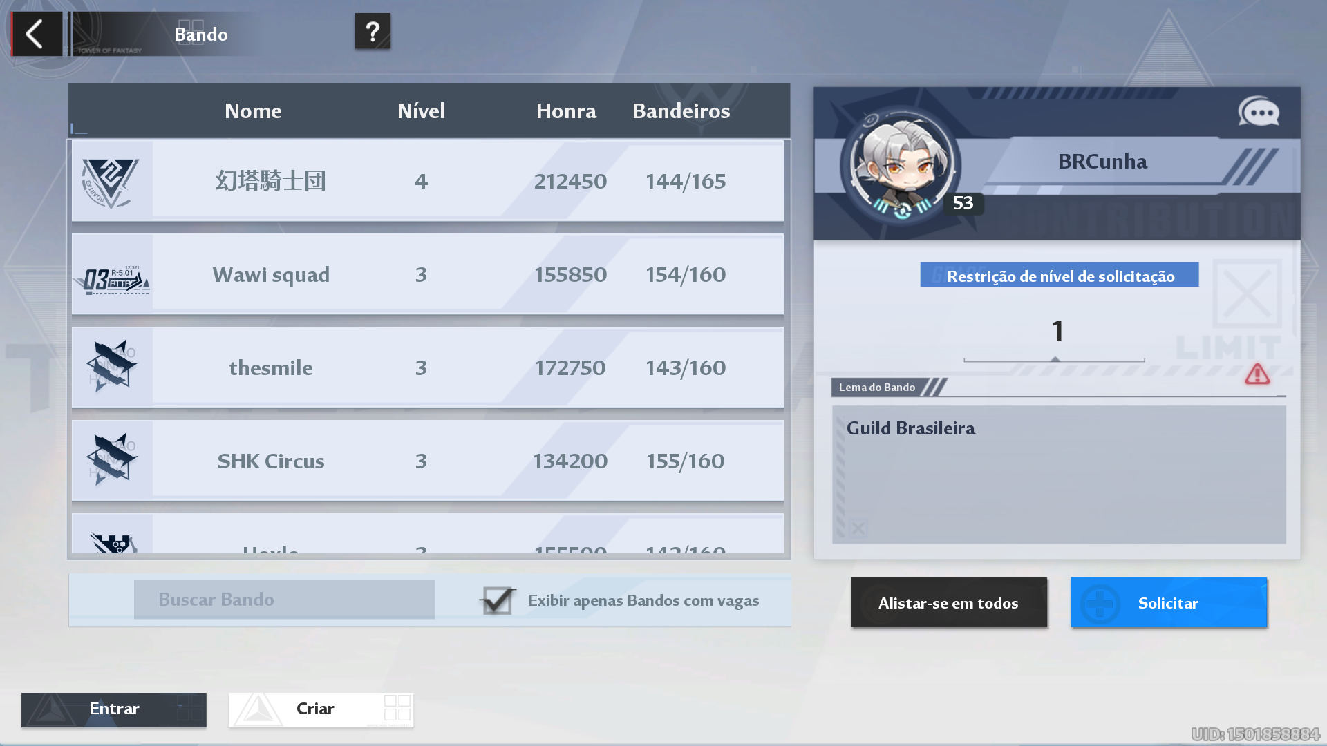 | Ao clicar no menu do bando, uma lista aparecerá. No lado esquerdo aparecerá nome, nível, honra e quantidade de jogadores em cada bando. No lado direito está o lema de cada bando e a opção de solicitar entrada. Há também a opção de “Alistar-se a todos”. |