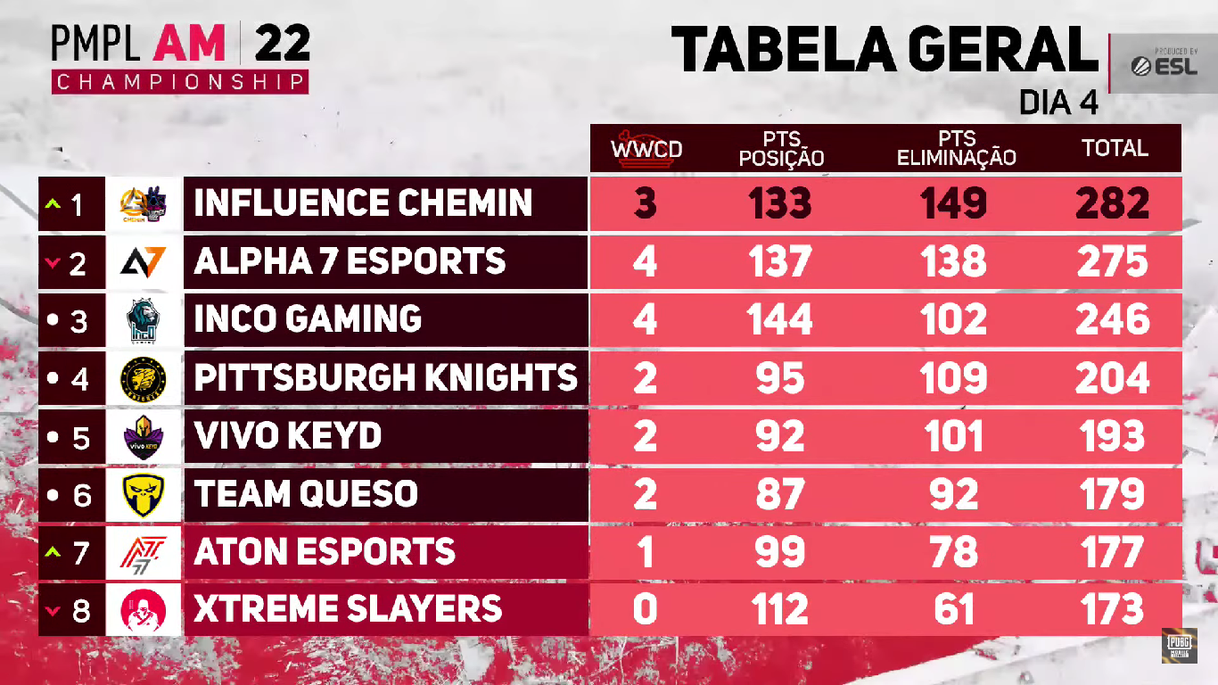 O segundo lugar ficou para a Alpha7, com 275 pontos, e a iNCO Gaming garantiu a terceira posição, com 246 pontos. Como a A7, Vivo Keyd e a Pittsburgh Knights já estão com as vagas para PUBG MOBILE Global Championship 2022 pelos pontos conquistados ao longo do ano, os PMGC Points, em campeonatos oficiais, a segunda vaga foi automaticamente para a iNCO e a terceira para a Team Queso.