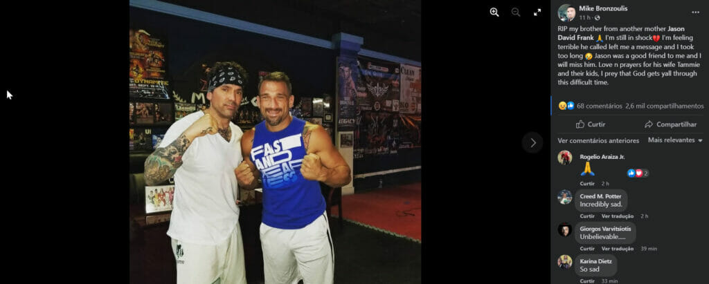 Em seu perfil no Facebook, o treinador deixou uma mensagem de pesar sobre a morte de frank juntamente com uma foto de ambos lado a lado. “RIP meu irmão de outra mãe, Jason David Frank. Ainda estou em choque. Estou me sentindo péssimo, ele ligou, me deixou uma mensagem e eu demorei. Jason era um bom amigo para mim e vou sentir falta dele. Amor e orações por sua esposa Tammie e seus filhos. Rezo para que Deus os ajude neste momento difícil”, diz a mensagem.