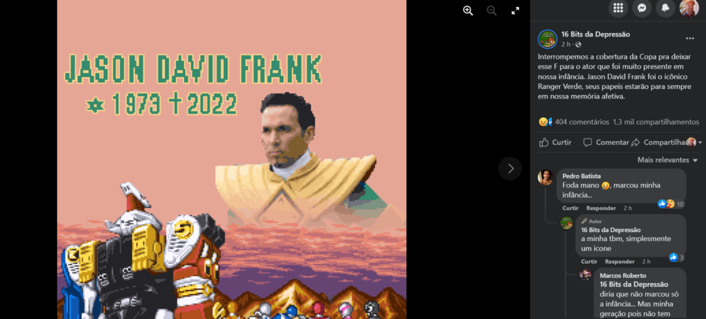 Na página 16 Bits da Depressão, uma arte feita para informar sobre o falecimento de Frank está reunindo muitos fãs nostáugicos, que estão tristes e chocados com a notícia da morte repentina do ator.