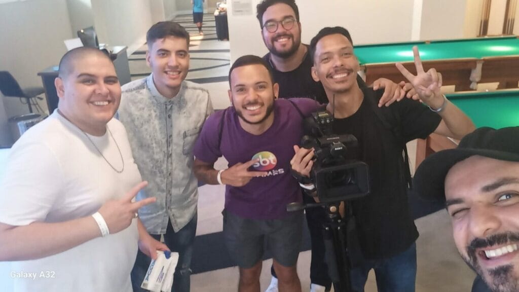 Equipe do Observatório de Games posa junto aos influencers do SBT Games. (Foto: Observatório de Games)