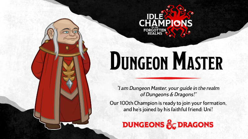 Os jogadores também poderão pegar a unicórnio Uni do clássico desenho animado de 1983 durante o evento. O Dungeon Master é o 100º campeão dos Idle Champions of the Forgotten Realms e se inspira diretamente no desenho, como seu hábito de desaparecer. Os desenvolvedores alegaram que depois de desaparecer durante o combate, o Dungeon Master será substituído por Uni.
