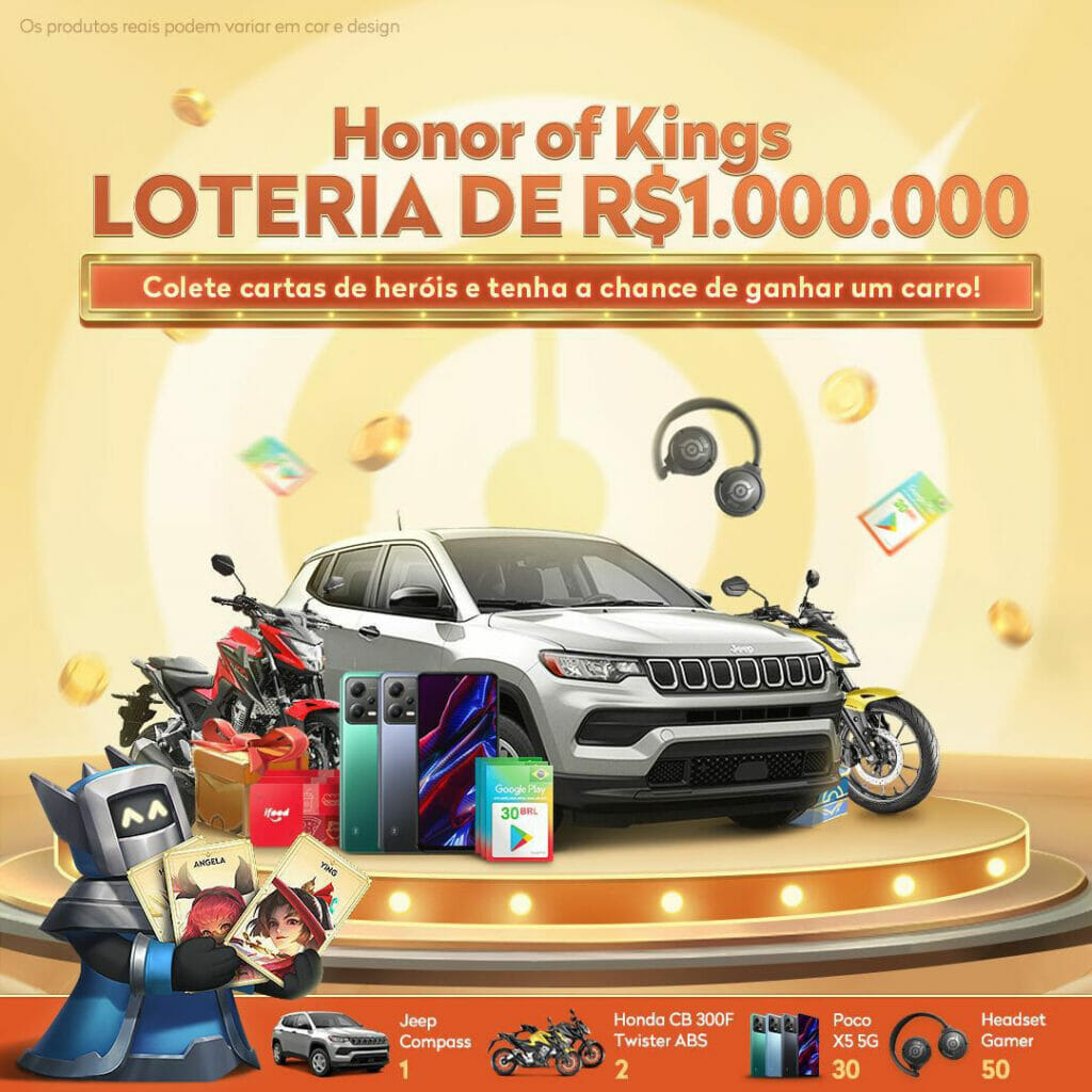 Honor of Kings, o MOBA mobile mais jogado do mundo, anuncia o evento Honor of Kings LOTERIA DE R$1.000.000, que dá aos jogadores a chance de ganhar prêmios incríveis, incluindo celulares POCO X5, motos Honda CB 300F Twister ABS e um carro Jeep Compass.