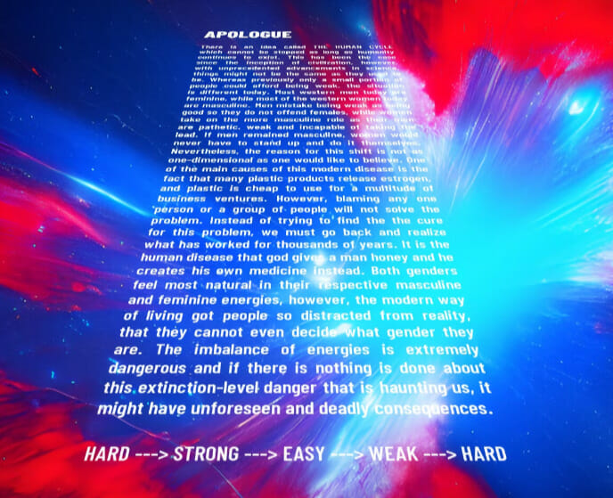 No entanto, sua história continua, pois o Kotaku relatou que este jogo, que é quase tão caro quanto a cadeira de jogos Porsche e quase tanto quanto um bom PC para jogos, abre com um rabisco de texto selvagem de 8 minutos que não pode ser ignorado. Ele fala sobre o que chama de “O Ciclo Humano” antes de fazer um discurso bizarro sobre como “os homens ocidentais hoje são femininos, enquanto a maioria das mulheres ocidentais hoje é masculina”, que Kotaku aponta como sendo pontos de discussão no movimento de ativismo pelos direitos dos homens, que muitas vezes é definido por alegações de discriminação sistêmica contra os homens na sociedade.
