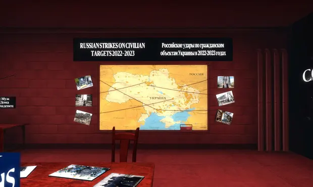 Em uma das paredes, os jogadores podem encontrar um mapa da Ucrânia que detalha os ataques relatados contra a população civil, enquanto uma gravação em russo lendo artigos de Helsingin Sanomat em voz alta toca ao fundo.