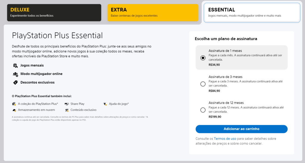 No PS Plus Essential, os assinantes possuem novos jogos todos os meses, modo multiplayer online, descontos exclusivos na PS Store e muito mais, disponíveis com os três planos de assinatura do PlayStation Plus. Atualmente os planos do Essential para os novos assinantes são: mensal, trimestral e anual.