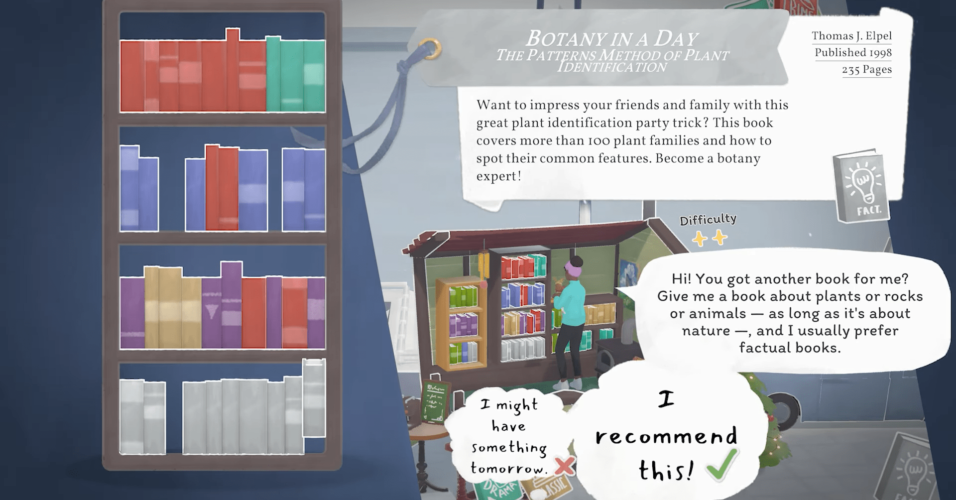 Alguns clientes ficam ansiosos se você não os ajudar imediatamente. Felizmente, eles não podem realmente ficar mal -que -me como turistas na vida real. Em vez disso, eles estão ansiosos por uma recomendação, e esses cenários apresentam um quebra-cabeça baseado em diálogo. Você ouvirá o que o cliente deseja e não gosta e oferecerá uma sugestão, combinando um título de suas ações com seus interesses para garantir uma venda. Eles estão simplesmente resolvidos e, com uma boa recomendação, o cliente irá alegremente se afastar com um novo título para aproveitar (e não deixá -lo aleatoriamente em uma mesa em uma seção diferente da loja).