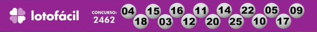Nesta sexta-feira (04/03), a Caixa Econômica Federal sorteia o concurso 2462 da Lotofácil. O prêmio para quem acertar as 15 dezenas está estimado em R$ 1,5 milhão. Confira os 15 números sorteados abaixo:
