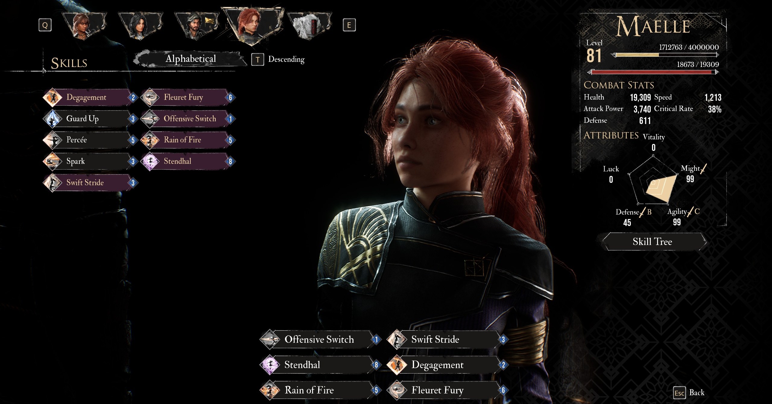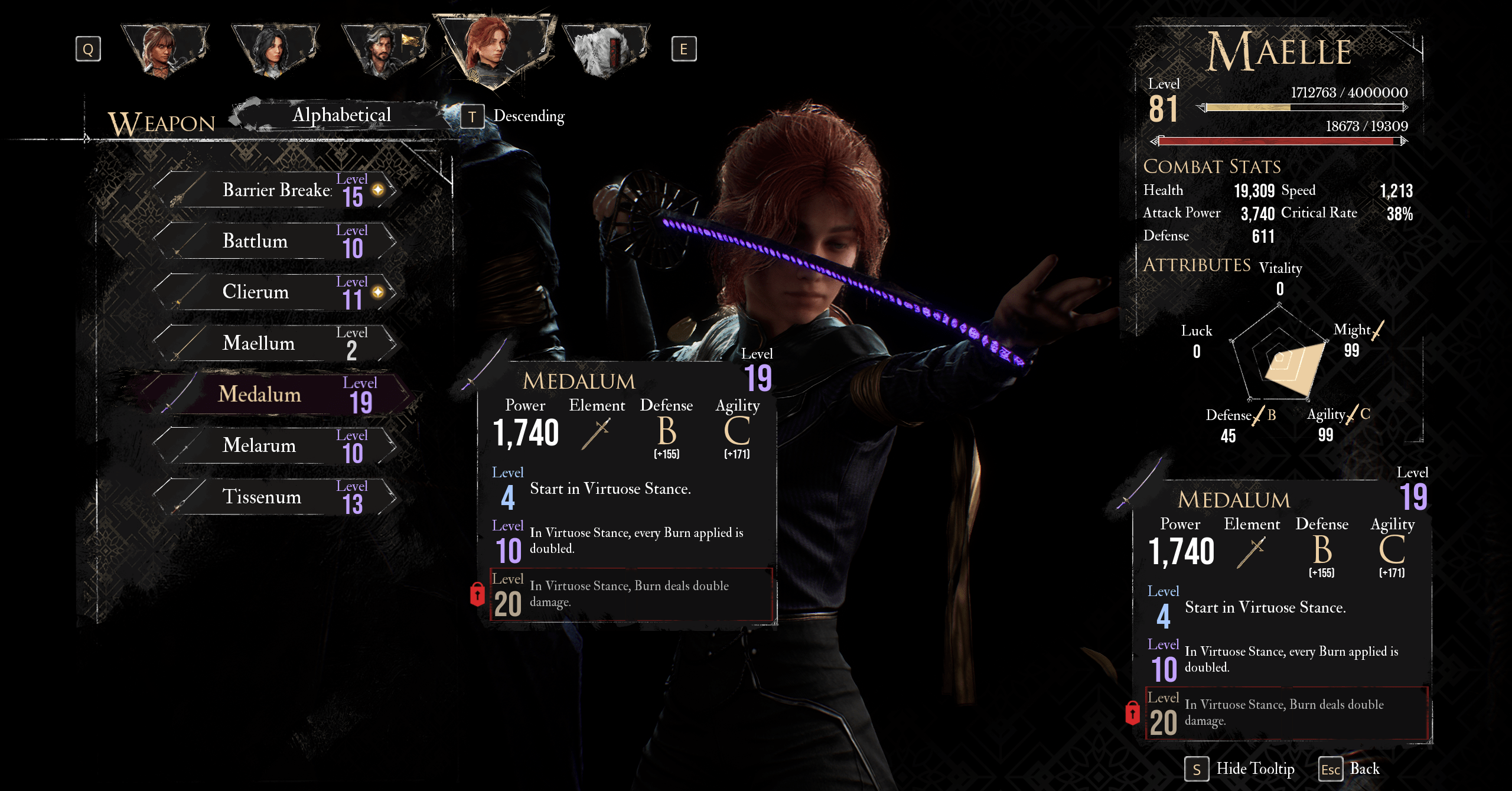 Agilidade e defesa são os melhores atributos para Maelle, porque são os atributos que a melhor arma de Maelle, o Medálum, escala ao lado. Maelle é equilibrada em torno da posição virtuosa firme que concede +200% de dano. O Medálum permite que você inicie um encontro já em postura virtuosa, colocando você em posição de terminar rapidamente qualquer batalha. Quanto às habilidades, embora Stendhal tenha sido nerfado, ainda é uma das melhores habilidades do jogo.