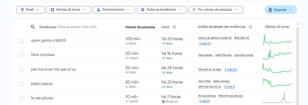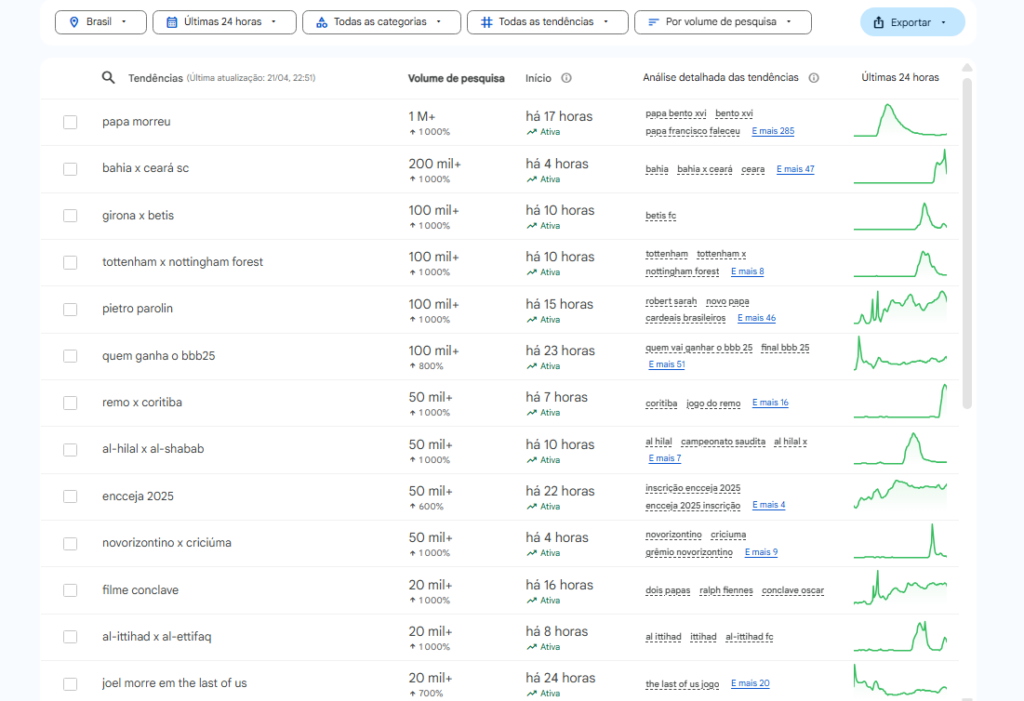 Entretanto, quando o filtro de categoria é acionado para o termo ‘Entretenimento’, os assuntos relacionados a ‘Papa’ e Joel tomam distâncias bem mais curtas nesse ranking. No caso do Papa, a curiosidade em torno do filme ‘Conclave’, que relata os bastidores do processo para se escolher o novo líder máximo da igreja disparou a ponto de alcançar o segundo lugar nas buscas no Brasil.