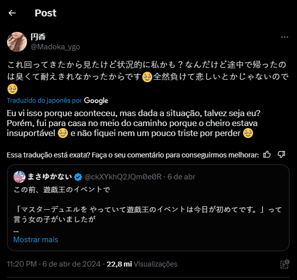 Uma mulher viralizou nas redes sociais após afirmar que deixou um evento de jogo de cartas de Yu-Gi-Oh devido ao cheiro terrível de muitos dos outros jogadores. Em 6 de abril, uma pessoa postou no X que eles estavam em um torneio local de cartas Yu-Gi-Oh em uma loja de hobby no Japão. O cartaz afirmava que eles se depararam com uma mulher que estava competindo no evento, mas ela saiu no meio do caminho e o pôster original culpava outros jogadores por serem muito agressivos e pouco receptivos a novos jogadores.