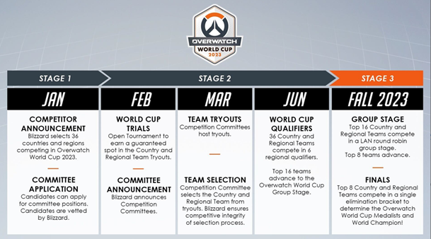 Em junho, depois que as escalações das equipes tiverem sido concluídas, as classificatórias da Copa Mundial de Overwatch acontecerão através de uma competição online regional, levando 16 dos 36 times para a próxima fase do torneio. Esses 16 times se enfrentarão em LAN no outono de 2023 para decidir os primeiros campeões da Copa Mundial desde 2019.