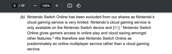 “O Nintendo Switch Online foi excluído de nossas ações porque o serviço de jogos em nuvem da Nintendo é muito limitado. O serviço de jogos em nuvem da Nintendo está disponível apenas no dispositivo Nintendo Switch e [REMOVIDO]”, diz o documento da CMA. Obviamente, a pergunta de um milhão de dólares é o que diabos é esse dispositivo redigido?