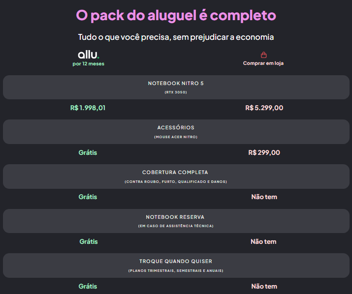 O serviço de aluguel de notebooks Acer da Allu oferece opções de contratação de três, seis ou doze meses. Os usuários recebem o notebook diretamente em suas residências, com suporte e manutenção garantidos pela Allu, visando proporcionar uma experiência contínua e satisfatória aos usuários.