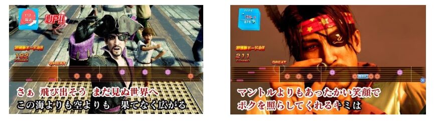 Aproveite o karaokê no estilo do Majima! Em adição às músicas temáticas Goro Pirates e os novos hits idols, algumas canções favoritas da série irão retornar! O karaokê também estará disponível enquanto estiver a bordo do navio. Esteja em terra firme ou em alto-mar, prepare-se para cantar com todo o seu coração! Confira mais destaques de músicas específicas abaixo: