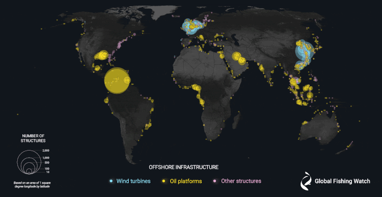 As estruturas petrolíferas têm muito mais navios fervilhando ao seu redor do que turbinas eólicas. Às vezes, navios-tanque são usados para transportar petróleo para a costa, como alternativa aos oleodutos. O número de estruturas petrolíferas cresceu 16% nos cinco anos estudados.