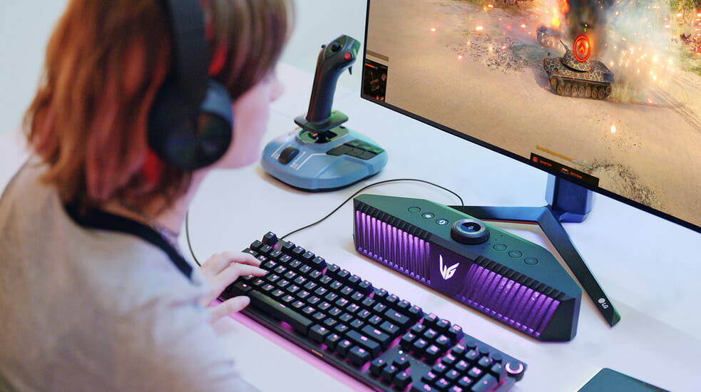 Chat de Voz: bate-papo por voz perfeito sem o uso de fones – O algoritmo Clear Voice Chat da LG oferece o máximo conforto, permitindo que você discuta claramente táticas com colegas de equipe sem usar o microfone de um fone de ouvido, mas apenas com um toque no botão do microfone da caixa de som. O cancelamento de eco evita ruídos que podem ocorrer com frequência, fazendo com que sua voz seja ouvida de forma alta e clara. Dessa forma, seus companheiros de equipe poderão ouvir seus comandos com clareza e maior definição durante o jogo.