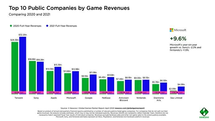 Foi observado também pela Newzoo o crescimento da Microsoft (9,6%) em comparação com os 1,9% da Nintendo e a queda da Sony (2,3%), e isso atribui ao sucesso do Game Pass, onde a Sony e a Nintendo lutaram muito após a pandemia de 2020.