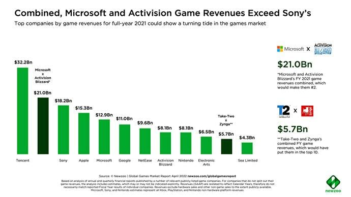 Como podemos observar, as mudanças na receita em comparação com o ano passado são enormes, com a Newzoon afirmando ainda que as aquisições provavelmente serão o maior diferenciar na condução do crescimento. É curioso notar também que, se as fusões tivessem acontecido mais cedo, a receita combinada da Microsoft e da Activision teria impulsionado o par acima da Sony para o 2º lugar. Além disso, se a Take-Two já tivesse posse da editora móvel Zynga, ela entraria no top 10.