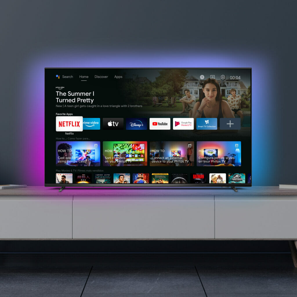 O grande destaque, no entanto, é a exclusiva tecnologia Ambilight nos quatro lados da TV, que proporciona um conjunto de luzes de LED localizadas nas bordas traseiras da TV que mudam de cor em sincronia com as cores da tela. Para melhorar ainda mais a experiência do Ambilight, este novo modelo é compatível com as lâmpadas inteligentes Philips Hue, que trazem uma experiência com Ambilight ainda mais envolvente. Uma grande novidade presente neste modelo é o painel Mini-LED, tecnologia que controla precisamente a iluminação e o brilho dos pixels, gerando contrastes e cores de altíssima qualidade que, juntamente com o novo processador de imagem P5 AI da Philips garantem uma experiência ainda mais imersiva para os consumidores.