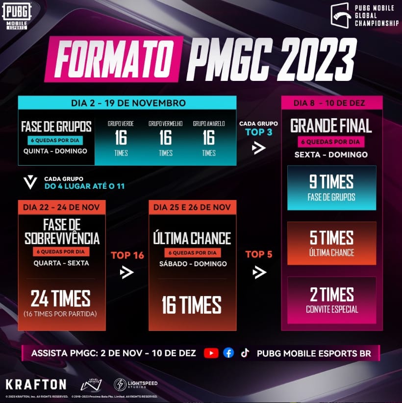 O torneio mais esperado do calendário de Esports do PUBG MOBILE começa oficialmente. A fase de grupos do PUBG MOBILE Global Championship 2023 (PMGC 2023) se inicia com 48 times divididos em três grupos: Verde, Vermelho e Amarelo. Cinco times brasileiros marcam presença neste torneio que definirá quem é a melhor equipe do battle royale em todo o mundo. A Grande Final ocorrerá de 8 a 10 de dezembro.
