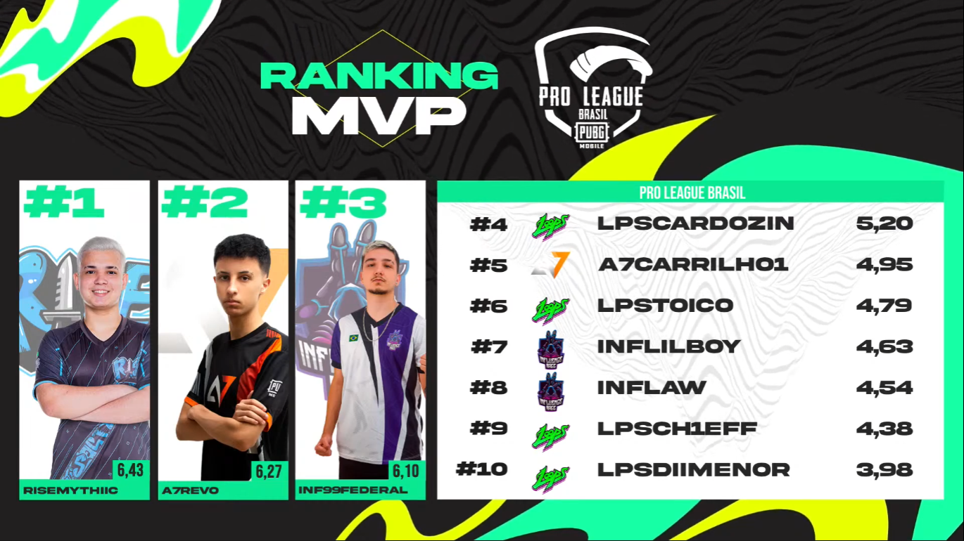 | A disputa pelo MVP (Most Valuable Player, ou ‘Jogador Mais Valioso’) da competição está acirrada, com jogadores de times diferentes no TOP 4: Mythic (Rise Sports), Revo (Alpha7 Sports), Federal (Influence Rage E-Sports)e Cardozin (Loops Esports)estão alterando em cada partida a briga pelo TOP 1.