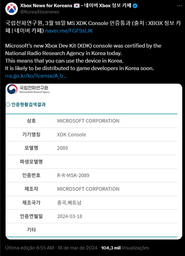 Enquanto isso, na Coreia do Sul, um novo devkit do Xbox foi registrado e no país, é necessário o certificado para o uso de dispositivos eletrônicos para garantir que eles não interfiram na rede de rádio. Antes de os últimos consoles Xbox chegarem no mercado oficialmente, eles também passaram pelos mesmos processos. Confira clicando aqui.