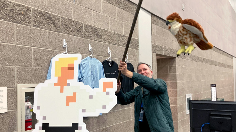 Digital Eclipse CSO and Head of Publishing Justin Bailey summons Karateka’s dreaded hawk at the Portland Retro Expo