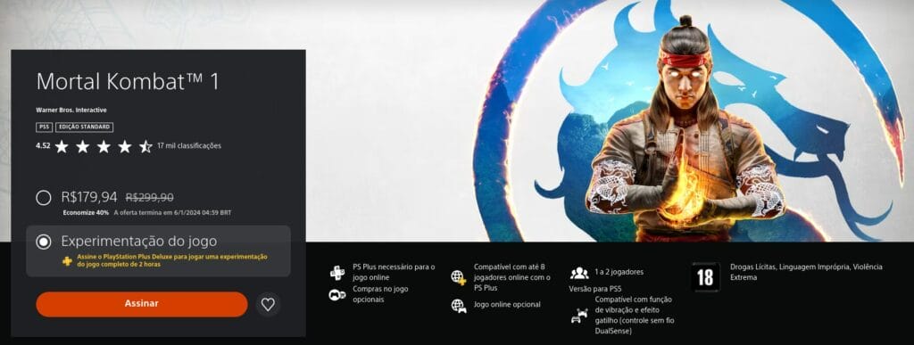 Está no Nosso Sangue! Descubra um Universo renascido de Mortal Kombat criado pelo Deus do Fogo Liu Kang. Mortal Kombat 1 inaugura uma nova era da franquia icônica com um novo sistema de luta, modos de jogo e fatalities! Conforme descrito na página do jogo, Mortal Kombat 1 está disponível para ser testado por até duas horas.