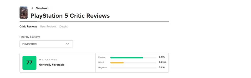 Teardown é outro jogo adicionado ao PS Plus Extra e Deluxe e está recebendo críticas sólidas dos fãs e jornalistas especializados. A versão PS5 de Teardown tem uma pontuação de 77 no Metacritic com base em sete análises, sendo cinco delas positivas e as duas restantes apresentando uma classificação mista.