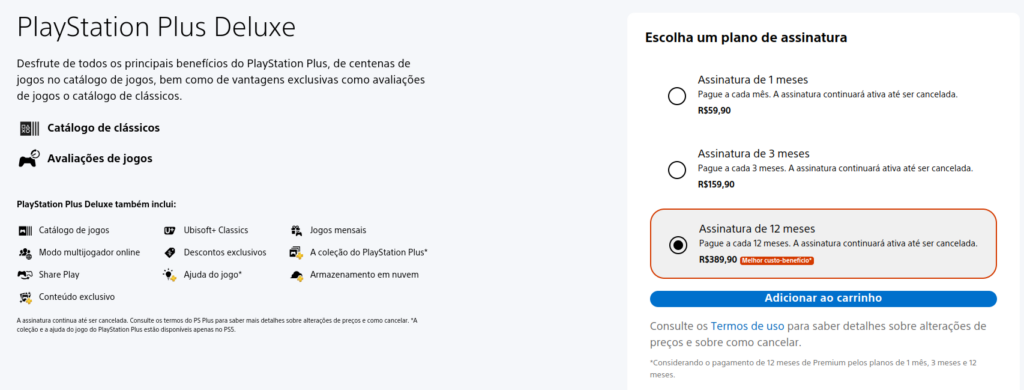 Estes valores entrarão em vigor já no dia 6 de setembro de 2023, e devem afugentar um pouco os novos assinantes. Aqueles que já são membros e fizeram suas assinaturas por 12 meses com renovação automática, o novo valor só passará a valer para renovações feitas após o dia 6 de novembro de 2023. Agora o PS Plus Essential custará R$ 278,90 (39,4% de aumento), PS Plus Extra terá o valor de R$ 475,90 (40% de aumento) e o PS Plus Deluxe passará a custar R$ 538,90 (38% de aumento). Todos esses valores são para o plano de 12 meses.