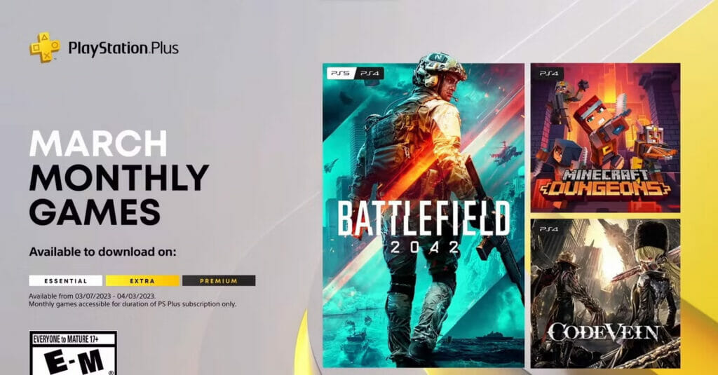 Os jogos PS Plus gratuitos para março de 2023 são: Battlefield 2042, Minecraft Dungeons e Code Vein,. Todos os três estarão disponíveis para assinantes do PS Plus em 7 de março. Battlefield 2042 terá as versões PS5 e PS4 disponíveis para jogar, embora não haja versões PS5 nativas de Minecraft Dungeons e Code Vein nos jogos PS Plus gratuitos para a programação de março de 2023. No entanto, todos os três títulos possam ser jogados no PS5 graças à compatibilidade com versões anteriores do console.