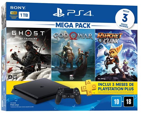 - Inclui um sistema PlayStation 4 fino de 1 TB, um controle sem fio DUALSHOCK 4, discos de Blu-ray de Ghost of Tsushima, God of War e Ratchet & Clank e um voucher para PlayStation Plus de 3 meses