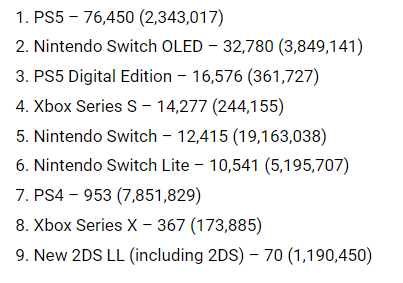 O salto nas vendas reflete a maior disponibilidade de estoque. No mês passado, a Sony sinalizou que a longa batalha do PS5 com problemas de abastecimento finalmente acabou, e a empresa disse que espera que o console quebre o recorde de vendas do PS4 nos primeiros três meses de um ano normal. O forte desempenho do PS5 da semana passada não se reflete na tabela de software (acima), onde as 10 primeiras posições são todas ocupadas por jogos do Nintendo Switch.