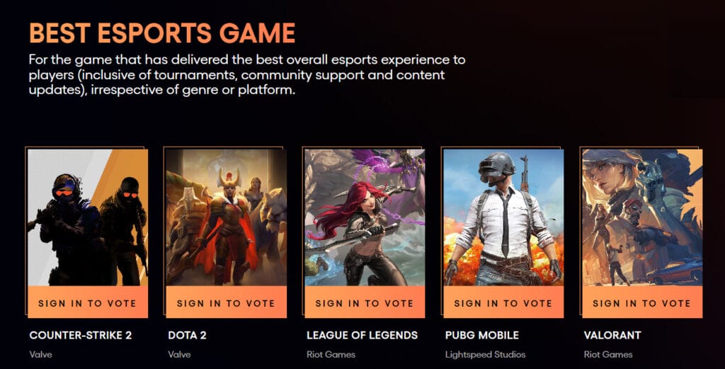 Os indicados do The Game Awards 2023 são escolhidos por um júri composto pelas principais organizações jornalísticas de games do mundo. Após a definição, o voto é aberto para o público, podendo ser realizado no site oficial do evento. O PUBG MOBILE concorre na categoria de “Melhor Jogo de Esports”, prêmio dado ao título que ofereceu a melhor experiência aos jogadores profissionais e comunidade.