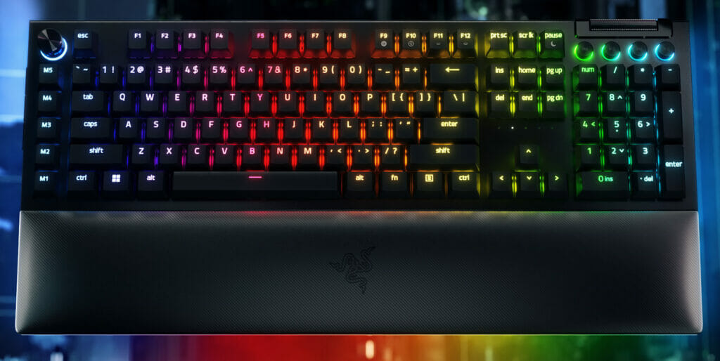 O novo BlackWidow V4 Pro foi desenhado para oferecer imersão total ao usuário por meio da tecnologia Razer Chroma RGB, que retroilumina o periférico tecla a tecla dando um brilho intenso através do invólucro transparente do switch, que produz um efeito RGB mais vívido. Esse recurso é amplificado pela iluminação de 38 zonas, que se estende ao descanso de pulso do periférico, que tem revestimento em material sintético macio que imita couro e é fixado magneticamente ao teclado.