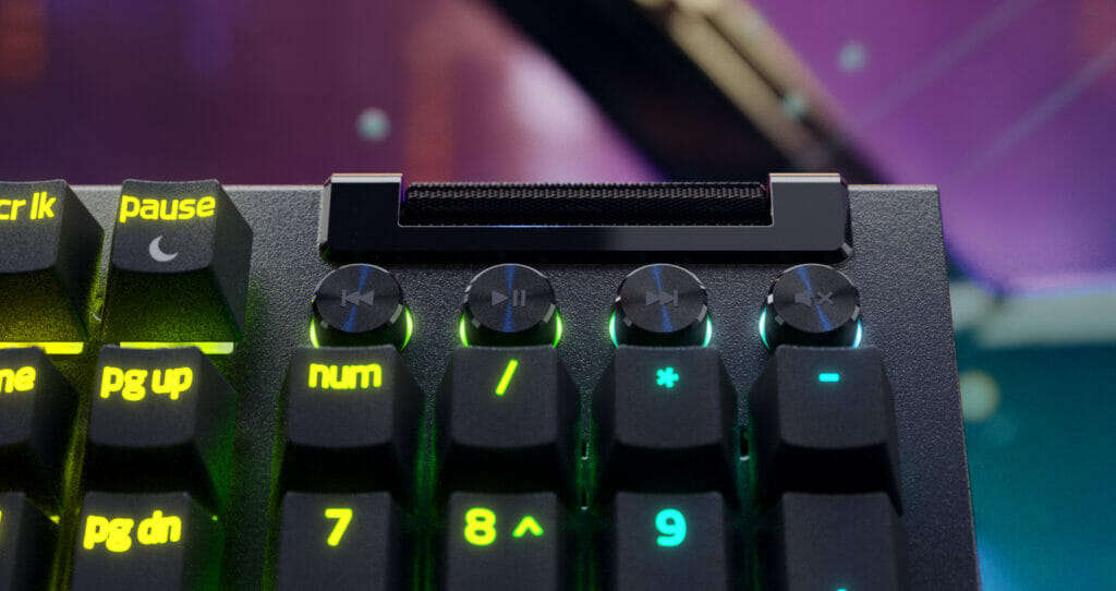 Uma das principais novidades do BlackWidow V4 Pro, o botão giratório Command Dial oferece controles avançados e atalhos para serem usados em acessos rápidos a comandos de desktop e dentro dos jogos. Já as teclas macro dedicadas permitem que tarefas complexas sejam executadas a partir do clique de um único botão, mesmo durante os momentos mais intensos das partidas.