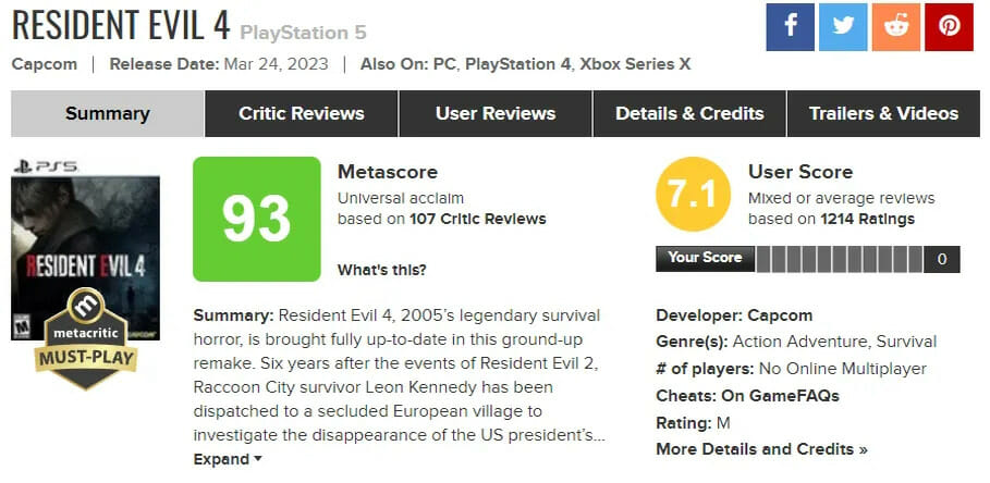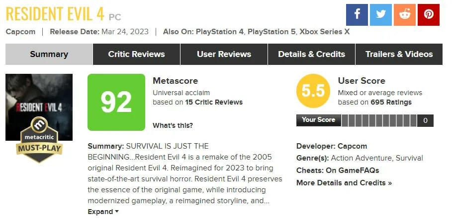 A reimaginação da Capcom do clássico do survival horror recebeu elogios quase universais dos críticos, e os jogadores criativos já projetaram uma série de mods muitas vezes hilários para o lançamento de Resident Evil 4 para PC. Embora os lançamentos PS5, PC e Xbox Series X do remake de Resident Evil 4 tenham um Metascore acima de 90 no momento da redação deste artigo, a pontuação do usuário para cada lançamento conta uma história decididamente diferente.