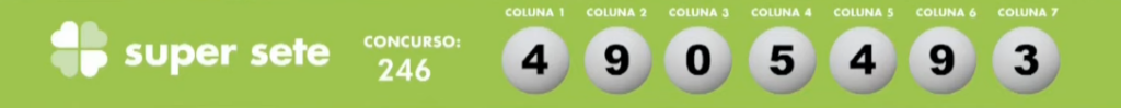 Nesta sexta (20), a Caixa sorteou o concurso 246 da loteria do Super Sete. E mais uma vez, a rodada de sorteios da noite aconteceu à partir das 20h, direto do Espaço da Sorte, na Avenida Paulista. Confira abaixo os números sorteados e o vídeo do sorteio: