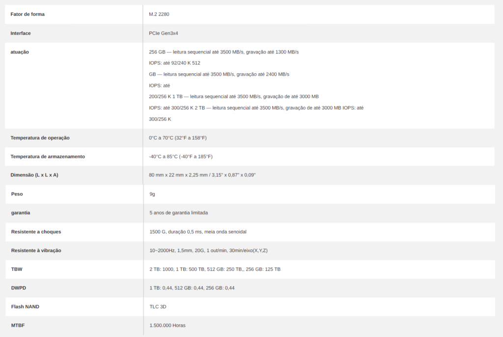 A placa é suportada pelo padrão de tecnologia PCIe Gen3x4 NVMe 1.4 e é feita com o mais recente flash 3D NAND. No que se refere ao armazenamento, o produto chega com opções de tamanho que vão de 256GB até 2TB. Confira abaixo as principais informações sobre o produto: